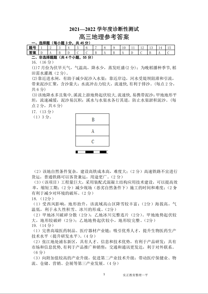 山东省烟台市2022.3高三年级第一次模拟试题地理答案