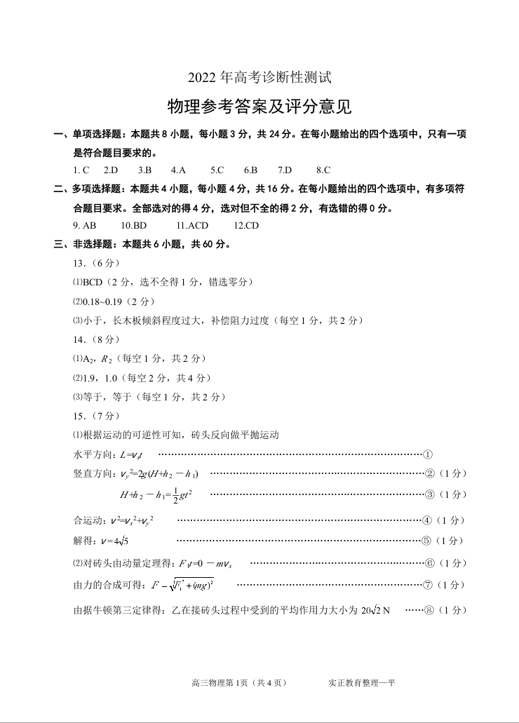 山东省烟台市2022.3高三年级第一次模拟试题物理答案