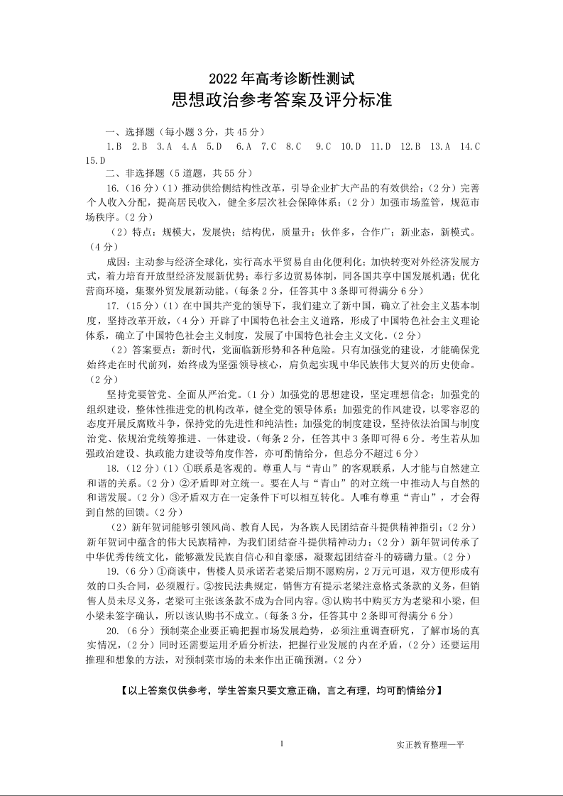 山东省烟台市2022.3高三年级第一次模拟试题政治答案