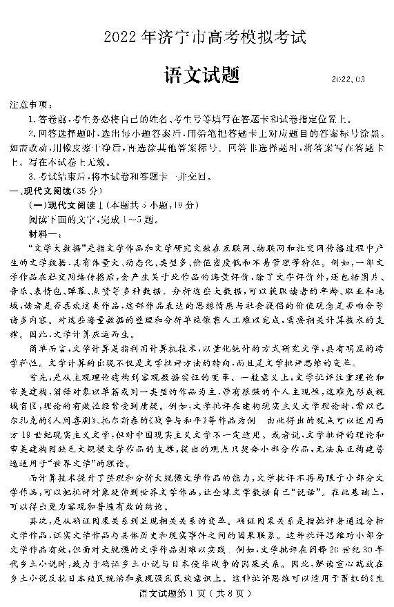 山东省济宁市2022.3高三年级第一次模拟试题语文及答案