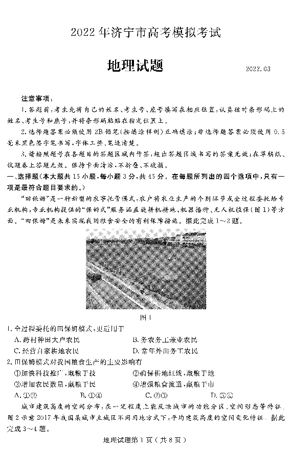 山东省济宁市2022.3高三年级第一次模拟试题地理及答案