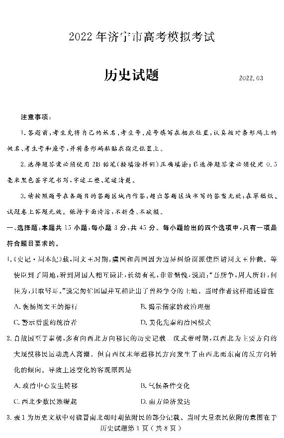 山东省济宁市2022.3高三年级第一次模拟试题历史及答案
