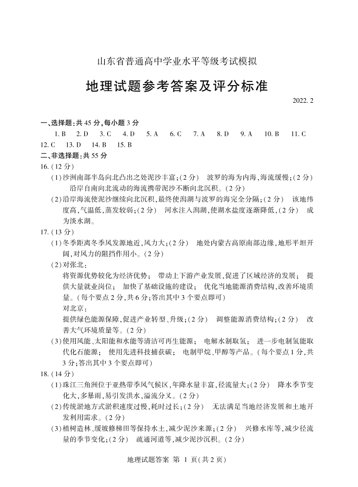 山东省临沂市2022.3高三年级第一次模拟试题地理答案