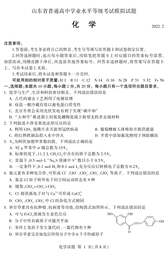 山东省临沂市2022.3高三年级第一次模拟试题化学及答案