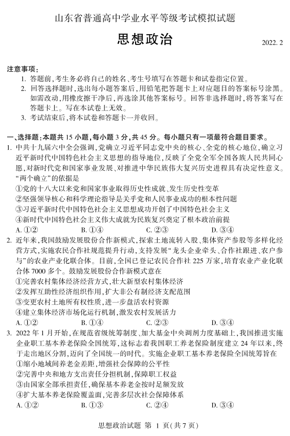 山东省临沂市2022.3高三年级第一次模拟试题政治及答案