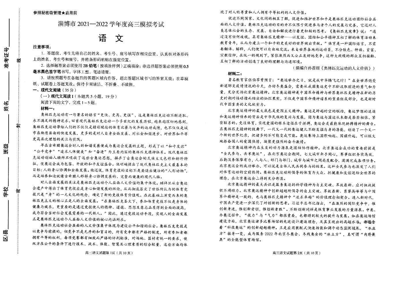 山东省淄博市2022.3高三年级第一次模拟试题语文