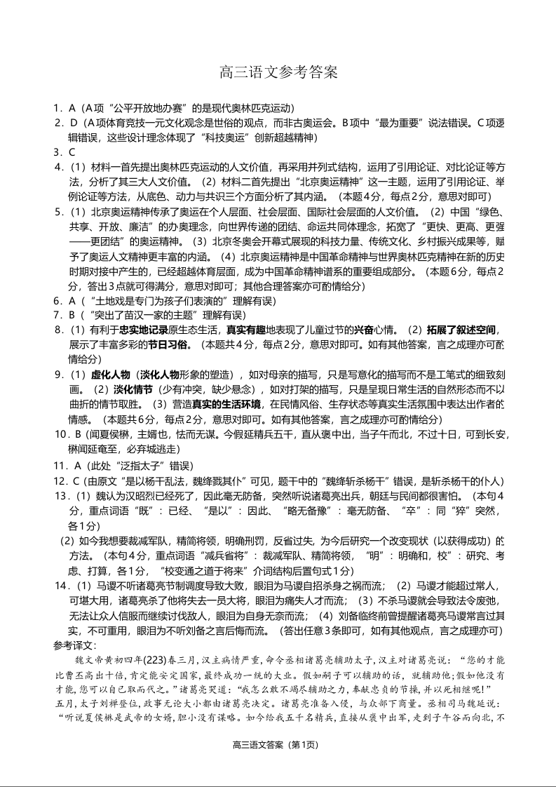 山东省淄博市2022.3高三年级第一次模拟试题语文答案