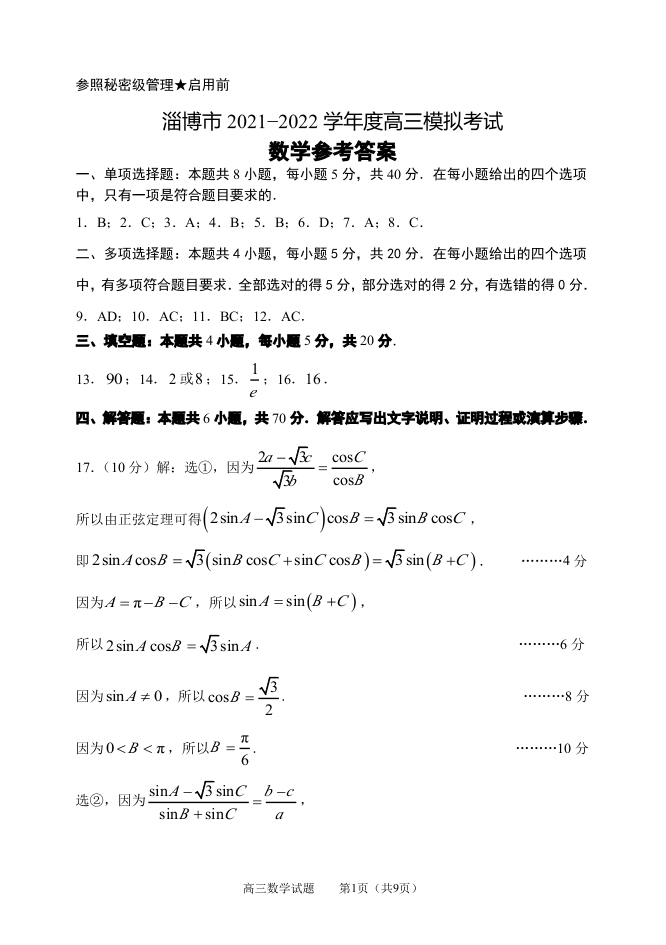 山东省淄博市2022.3高三年级第一次模拟试题数学答案