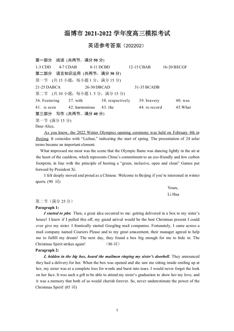 山东省淄博市2022.3高三年级第一次模拟试题英语答案