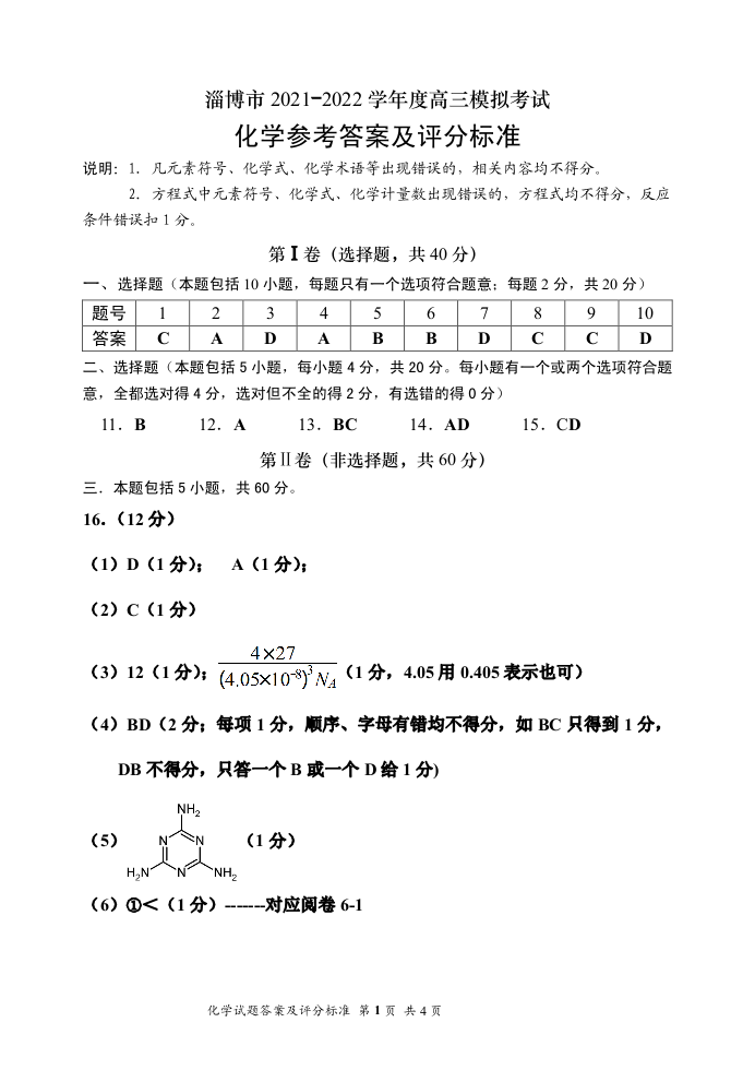山东省淄博市2022.3高三年级第一次模拟试题化学答案