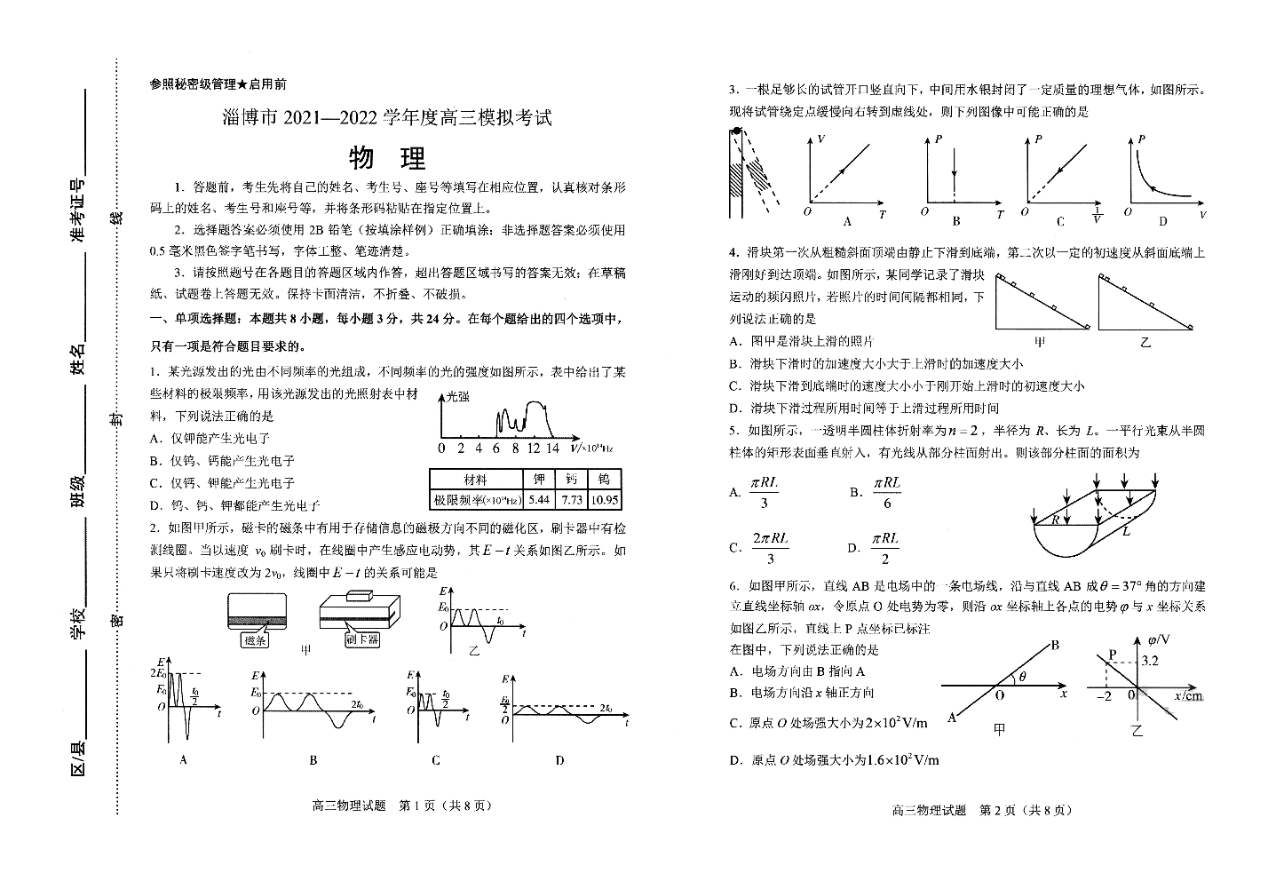 山东省淄博市2022.3高三年级第一次模拟试题物理