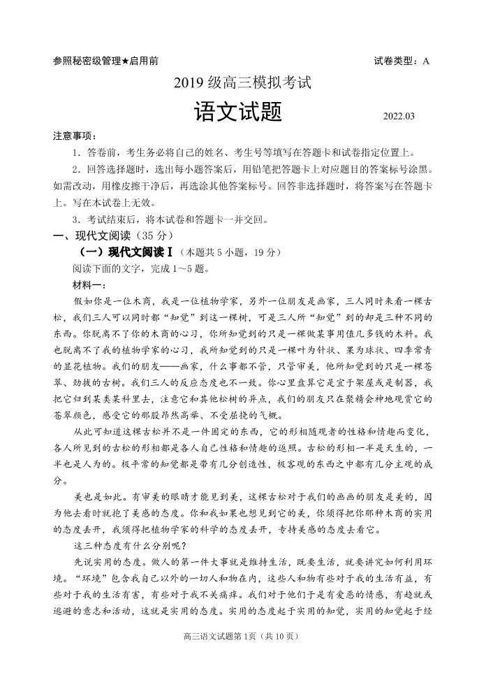 山东省日照市2022.3高三年级第一次模拟试题语文