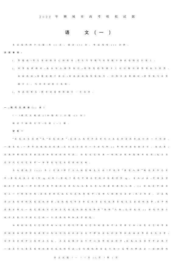 山东省聊城市2022.3高三年级第一次模拟试题语文