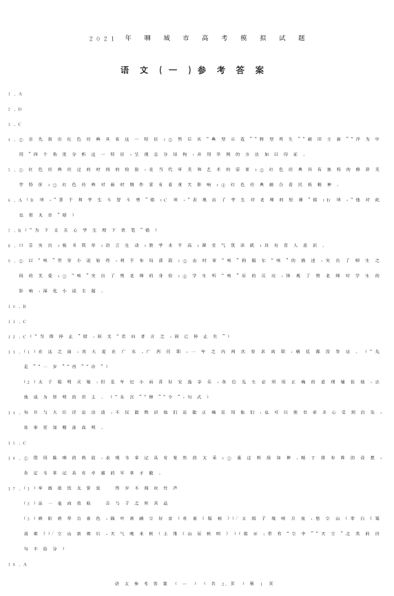 山东省聊城市2022.3高三年级第一次模拟试题语文答案