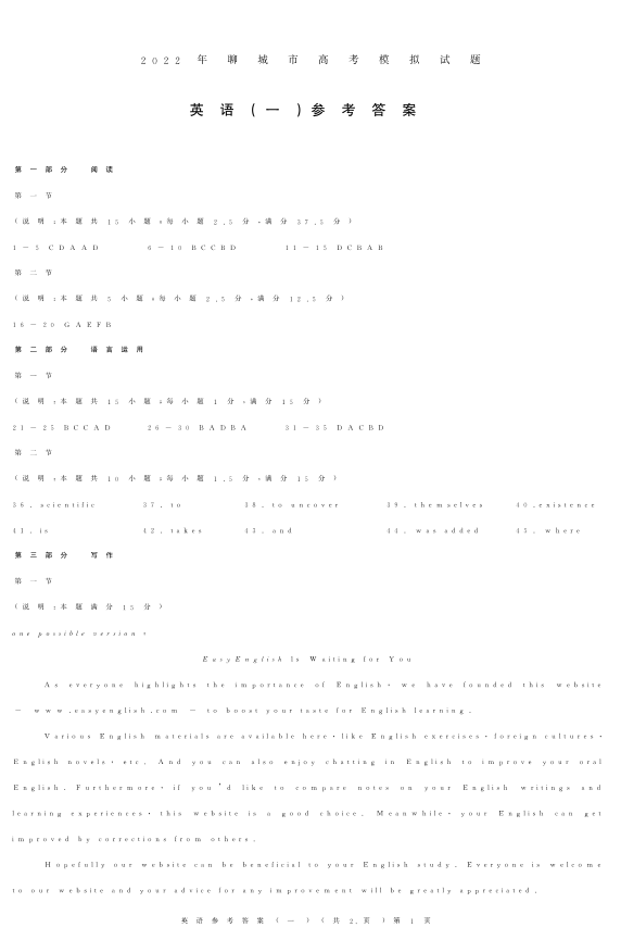 山东省聊城市2022.3高三年级第一次模拟试题英语答案