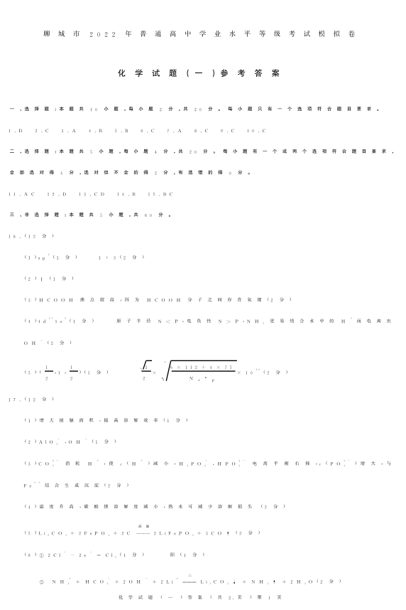 山东省聊城市2022.3高三年级第一次模拟试题化学答案