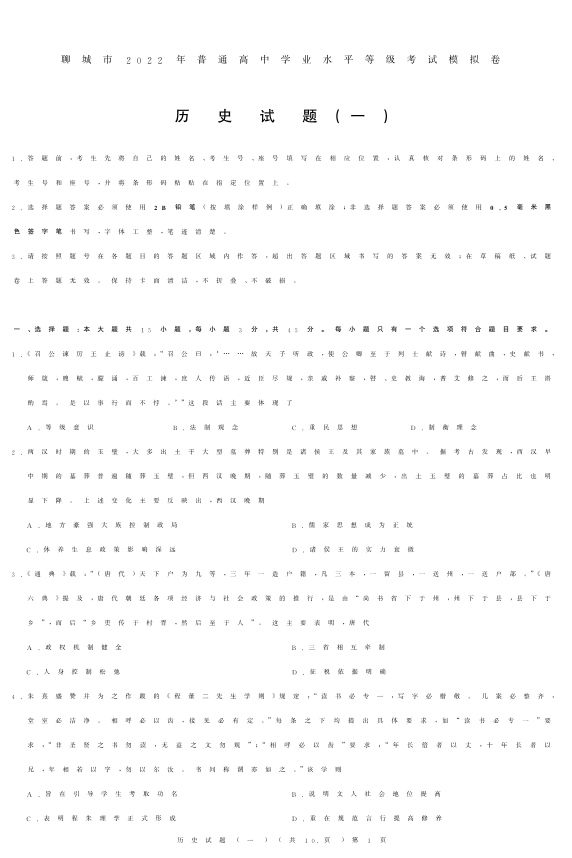 山东省聊城市2022.3高三年级第一次模拟试题历史