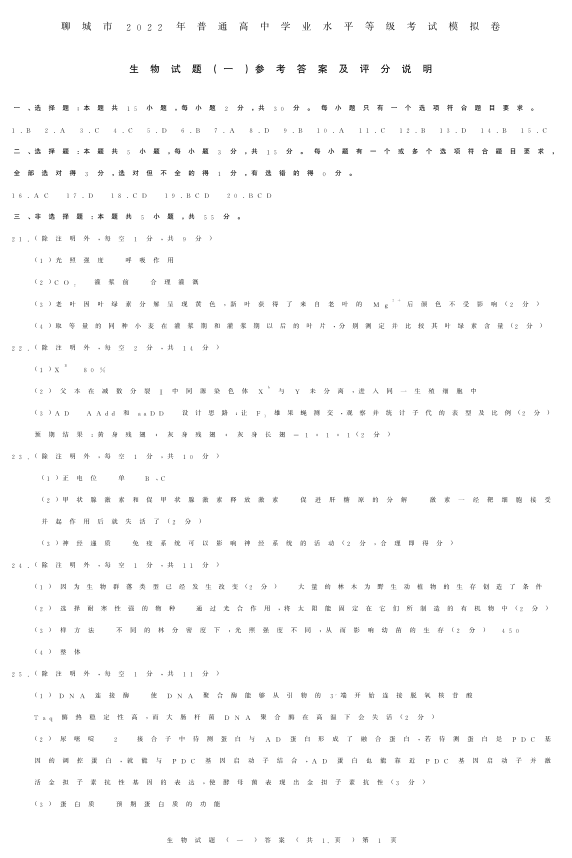 山东省聊城市2022.3高三年级第一次模拟试题生物答案