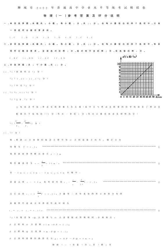山东省聊城市2022.3高三年级第一次模拟试题物理答案
