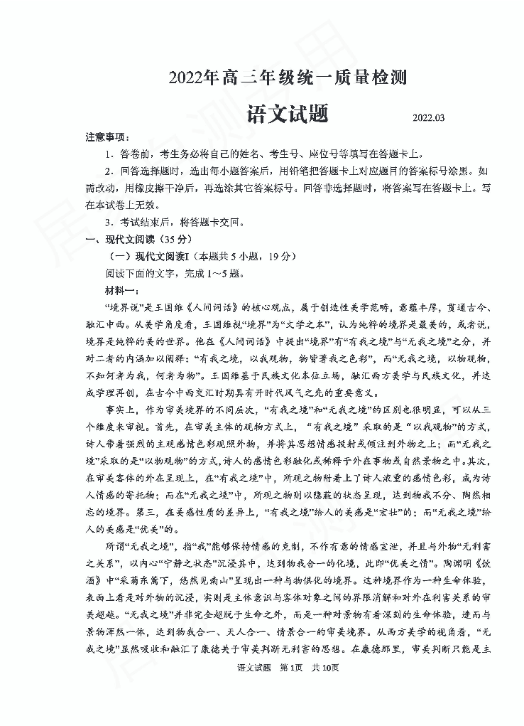 山东省青岛市2022.4高三年级第一次模拟试题语文