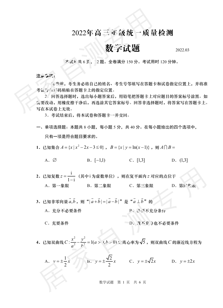 山东省青岛市2022.4高三年级第一次模拟试题数学
