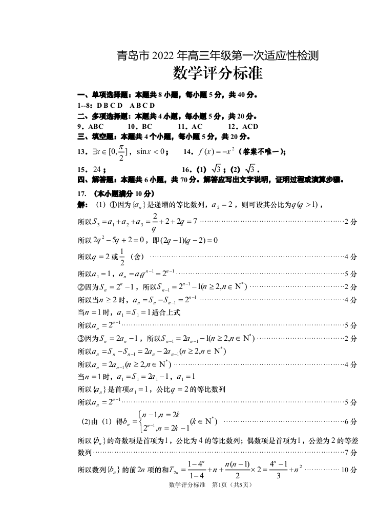 山东省青岛市2022.4高三年级第一次模拟试题数学答案