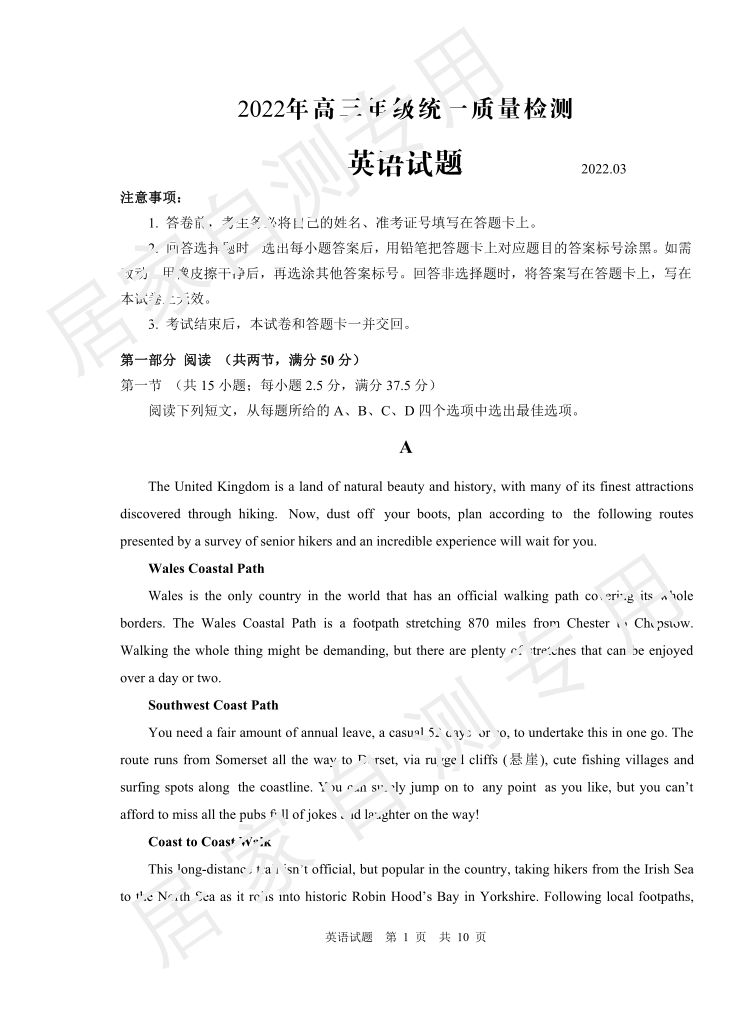 山东省青岛市2022.4高三年级第一次模拟试题英语
