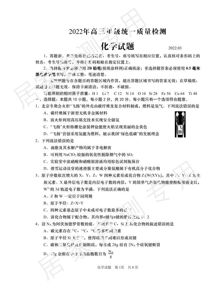 山东省青岛市2022.4高三年级第一次模拟试题化学