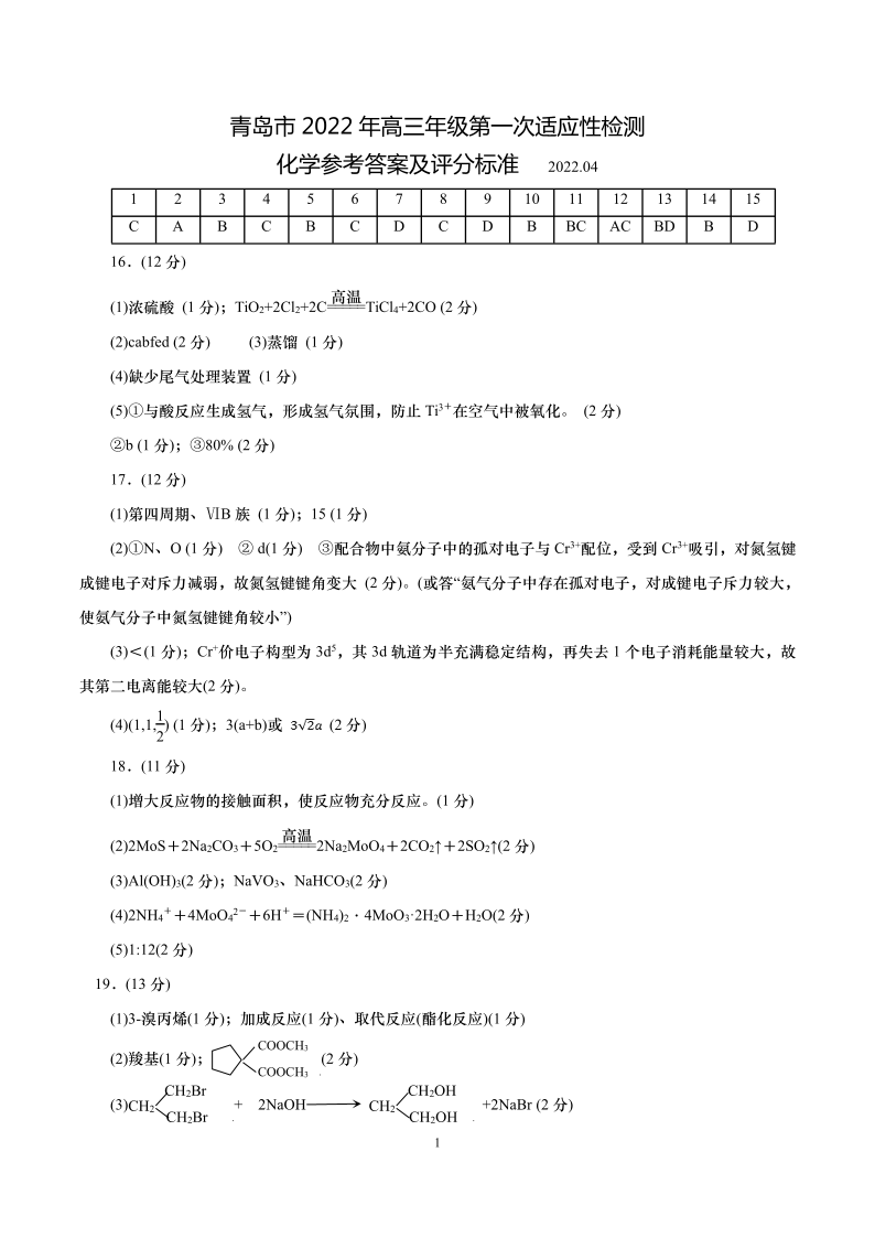 山东省青岛市2022.4高三年级第一次模拟试题化学答案