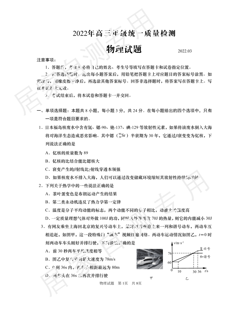 山东省青岛市2022.4高三年级第一次模拟试题物理