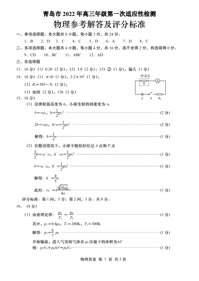 山东省青岛市2022.4高三年级第一次模拟试题物理答案