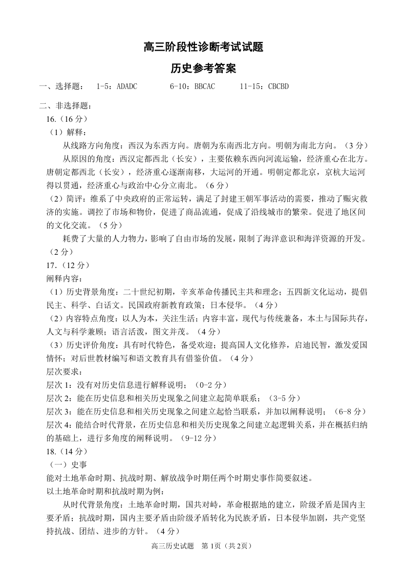 山东省淄博市2022.4高三年级第二次模拟试题历史答案