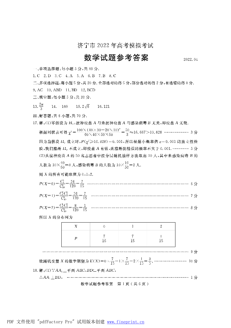 山东省济宁市2022.5高三年级第二次模拟试题数学答案