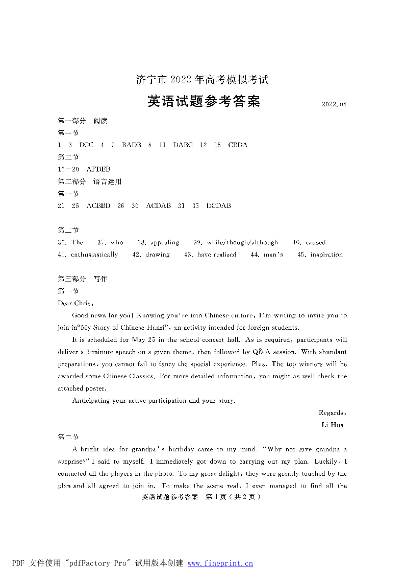 山东省济宁市2022.5高三年级第二次模拟试题英语答案
