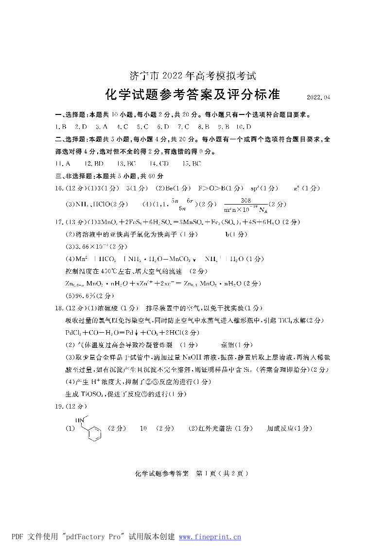 山东省济宁市2022.5高三年级第二次模拟试题化学答案