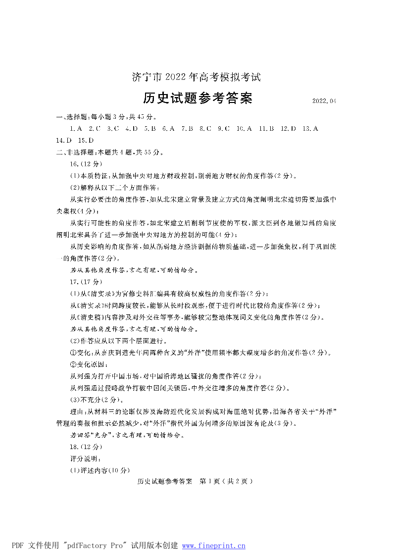 山东省济宁市2022.5高三年级第二次模拟试题历史答案