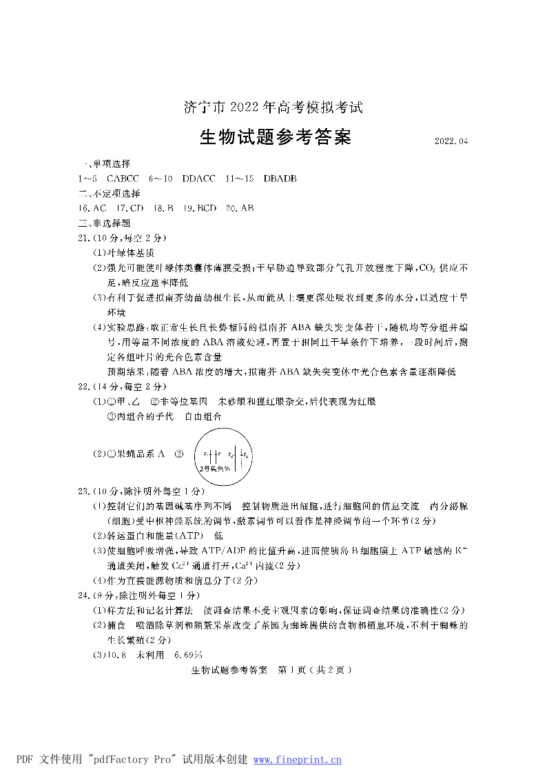 山东省济宁市2022.5高三年级第二次模拟试题生物答案