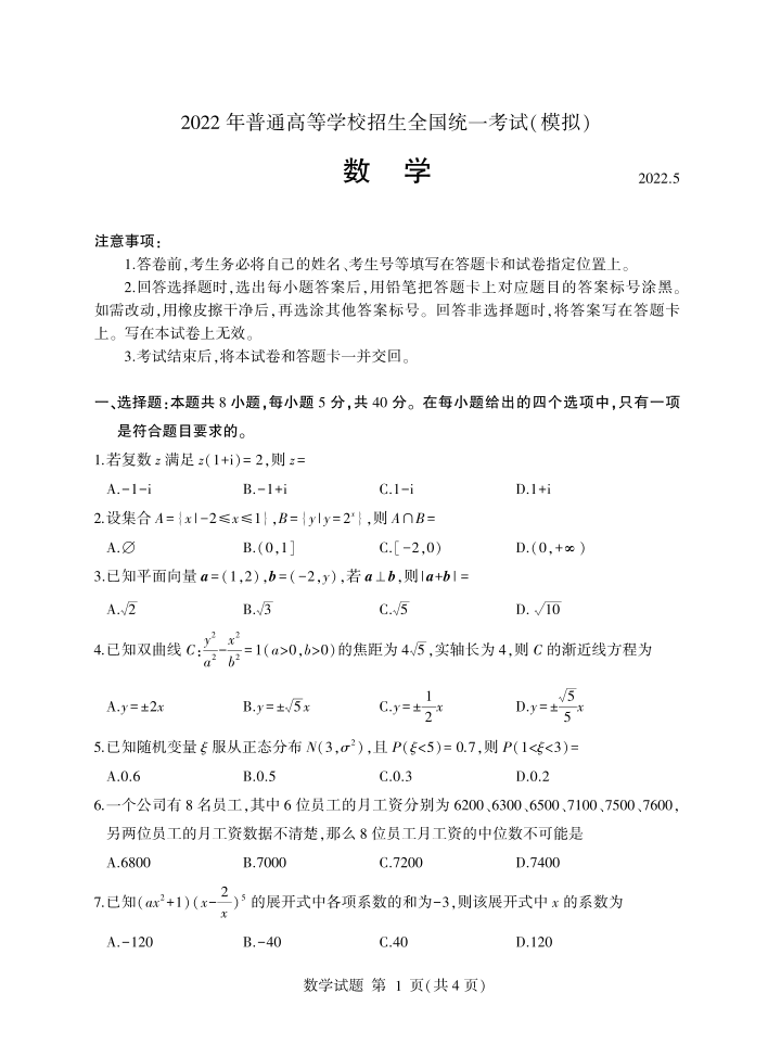 山东省临沂市2022.5高三年级第二次模拟试题数学及答案