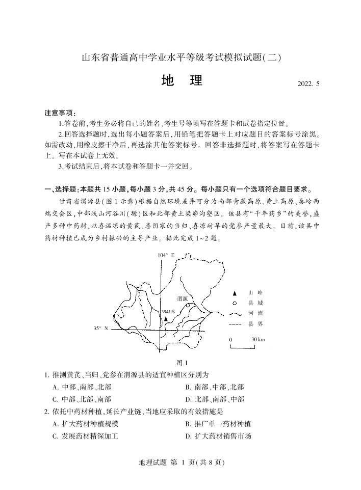 山东省临沂市2022.5高三年级第二次模拟试题地理及答案