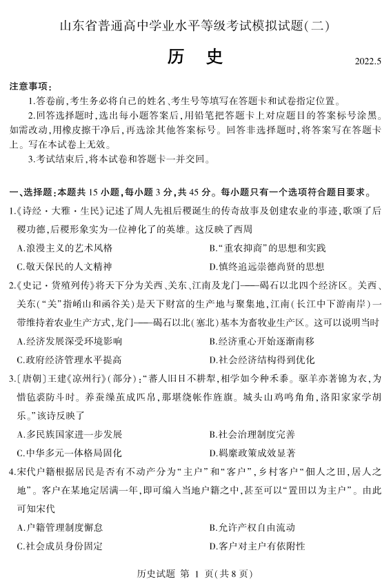 山东省临沂市2022.5高三年级第二次模拟试题历史及答案