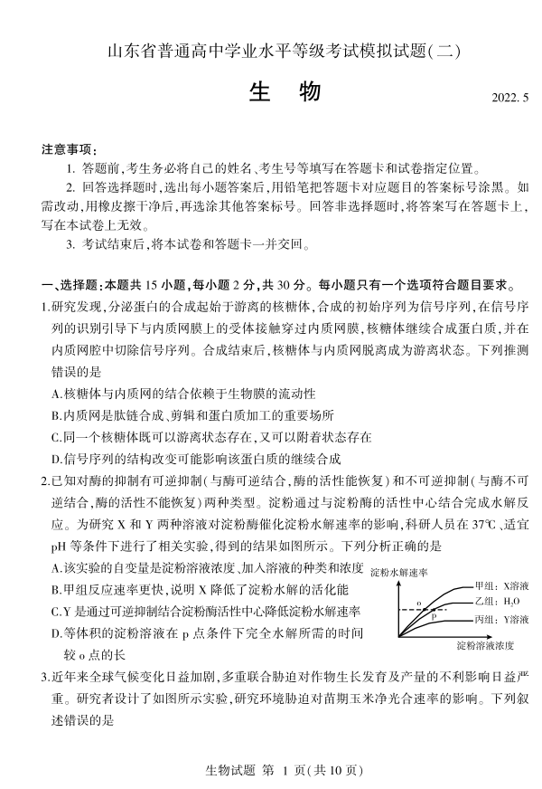 山东省临沂市2022.5高三年级第二次模拟试题生物及答案