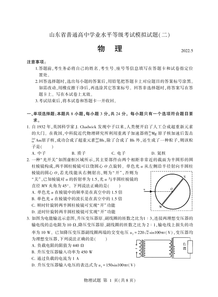 山东省临沂市2022.5高三年级第二次模拟试题物理及答案