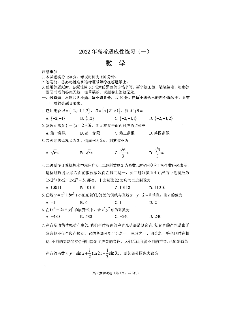 山东省烟台市2022.5高三年级第二次模拟试题数学