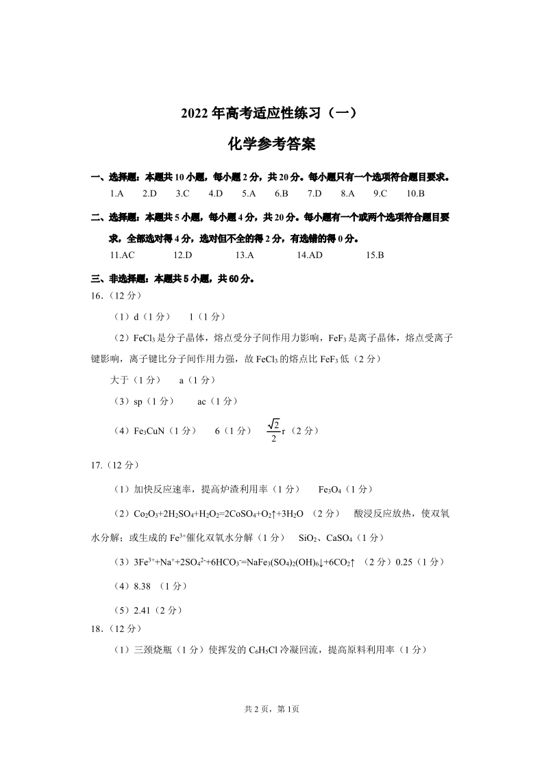 山东省烟台市2022.5高三年级第二次模拟试题化学答案