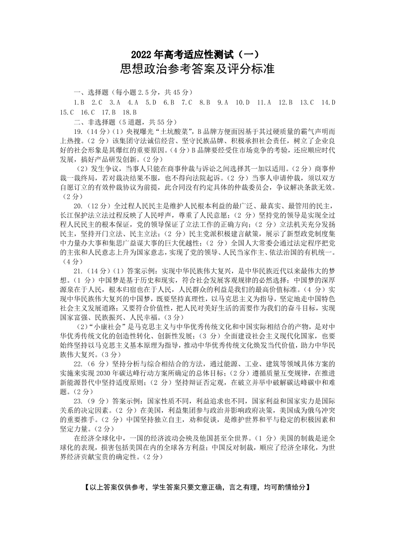 山东省烟台市2022.5高三年级第二次模拟试题政治答案