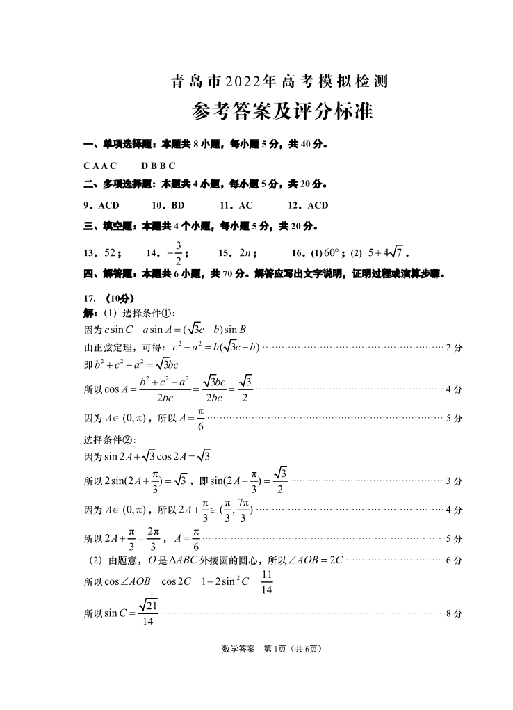 山东省青岛市2022.5高三年级第二次模拟试题数学答案