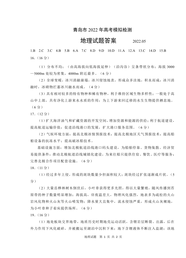 山东省青岛市2022.5高三年级第二次模拟试题地理答案