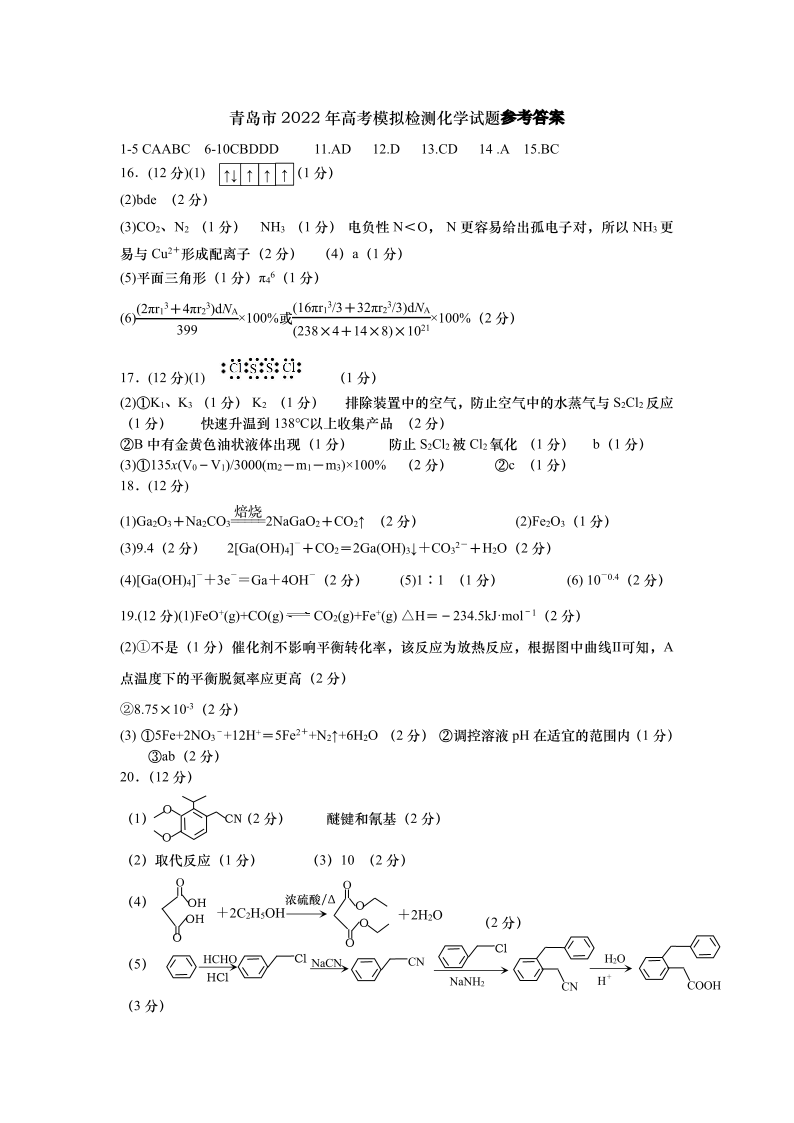 山东省青岛市2022.5高三年级第二次模拟试题化学答案