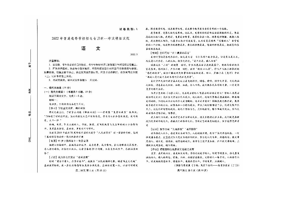 山东省潍坊市2022.5高三年级第三次模拟试题语文