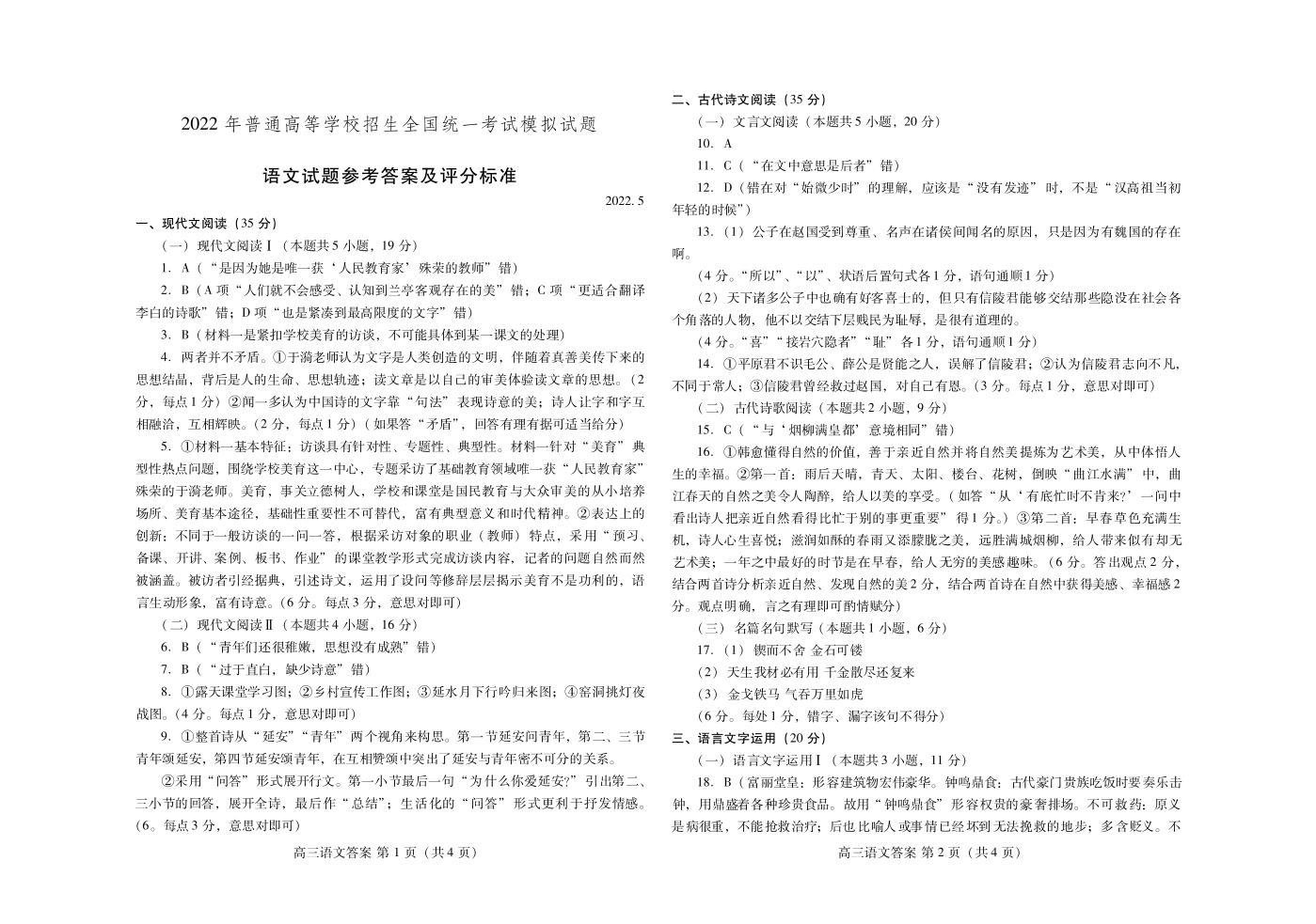 山东省潍坊市2022.5高三年级第三次模拟试题语文答案